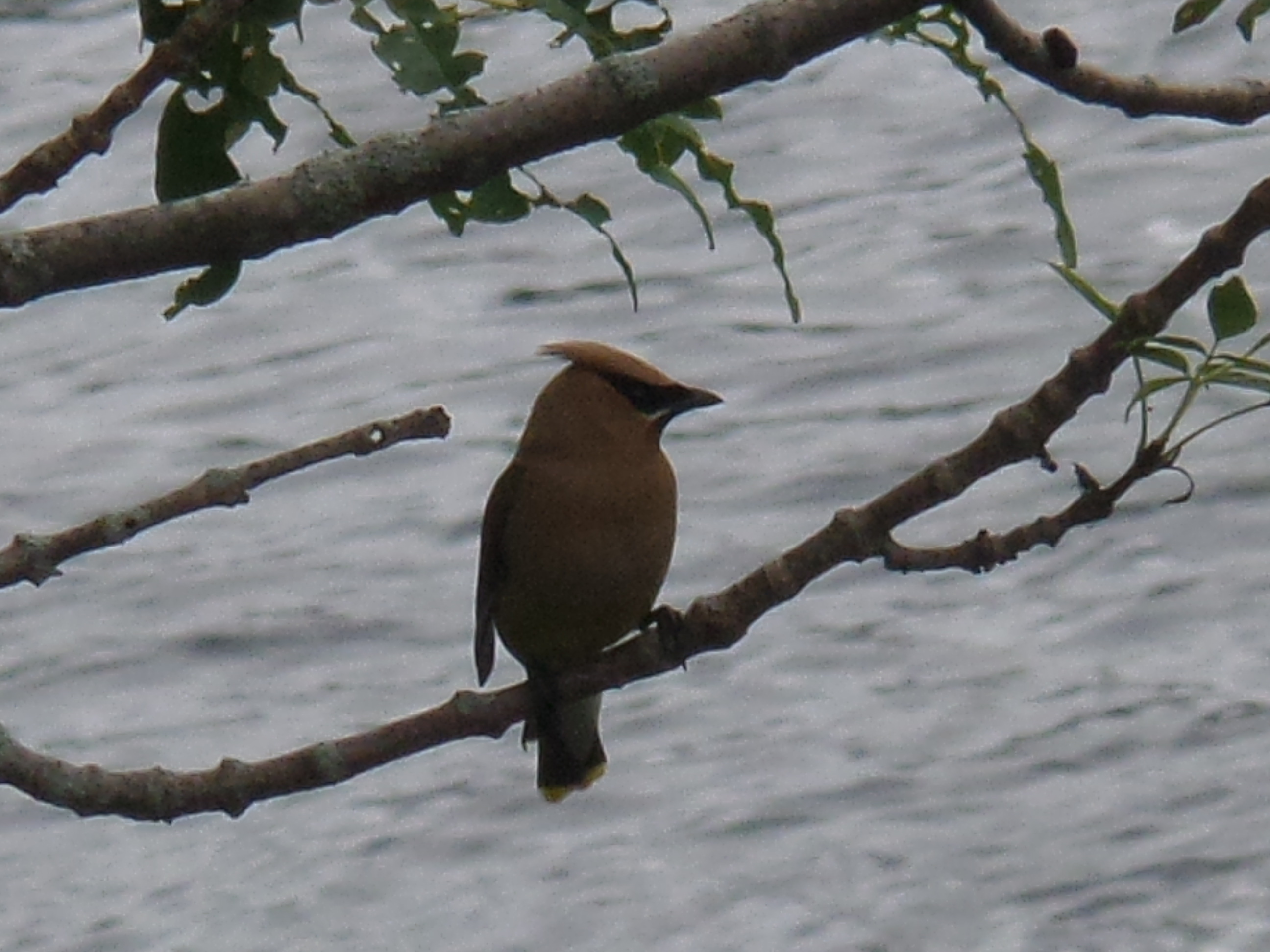 When we come to scenic spots we stop to look around and enjoy the view. We always look for wildlife along the way, birds being the most common form of wildlife we encounter. We stopped at Pratt Dam in Cumberland, and immediately noticed several birds just below the dam, perched on an overhanging branch. One after the other, the birds hovered, swooped about like swallows, then landed back on their perch. Some moved to the far side of the dam, but they continued their hunting behavior long enough for us to get some pretty good looks at them. This was a bird I’d never seen before–crest, buff color, interesting line of yellow on the tips of their tails–cedar waxwing?