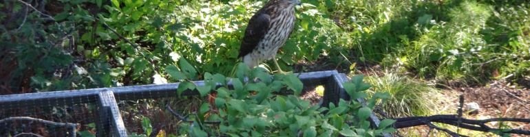 I looked out one morning to see a sparrow was busily seeking berries on the branches outside the netting, when suddenly a Red-tailed Hawk swooped into the clearing. For the next ten minutes the raptor soared back and forth across the opening in the trees, hunting for its next meal.