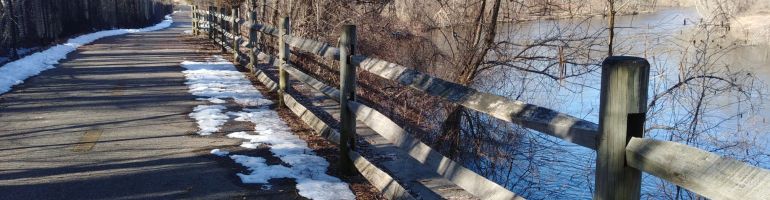 The river runs right next to the trail in this section of the Blackstone River Bikeway. Remaining snow is easily avoided