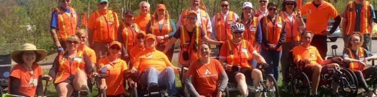 Volunteers, including Heritage Corridor VIPs, (full disclosure–I am a VIP 😉 ), folks from Millbury Federal Credit Union, Seven Hills Wheelmen, participants, and Blackstone Heritage Corridor staff gathered at 93 Canal Street, Blackstone, where MADCR Universal Access and All Out Adventures staff pulled up with vans full of adaptive bikes suited for almost any person’s needs. For many of us, it was not our first time volunteering, and even though the location was differently set up than where we met in Worcester last week, the routine was pretty close to the same.