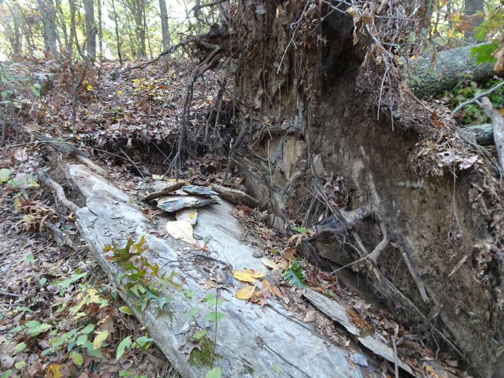 One blown over tree revealed that the tree had grown right on top of a large rock. Its roots were shallow, so when a storm came through, the tree blew right over, revealing the underside of the tree, as well as the flaky rock hidden underneath the tree roots for so many years.