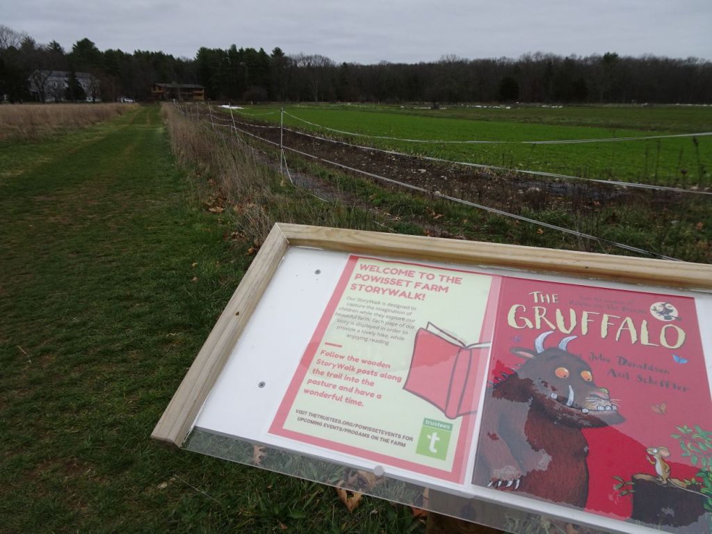 It may be that people hear “farm” and think it is simply a walk around a hay field, or simply a place to stop at their farm store, or collect their CSA farm shares. Instead, we found a story walk along the mowed trail around the garden beds, with two additional pastures with mowed circular paths around the edge of the pastures. No animals were in the fenced in pasture areas, but it appears these are used in the summer. Fencing was in good shape.
