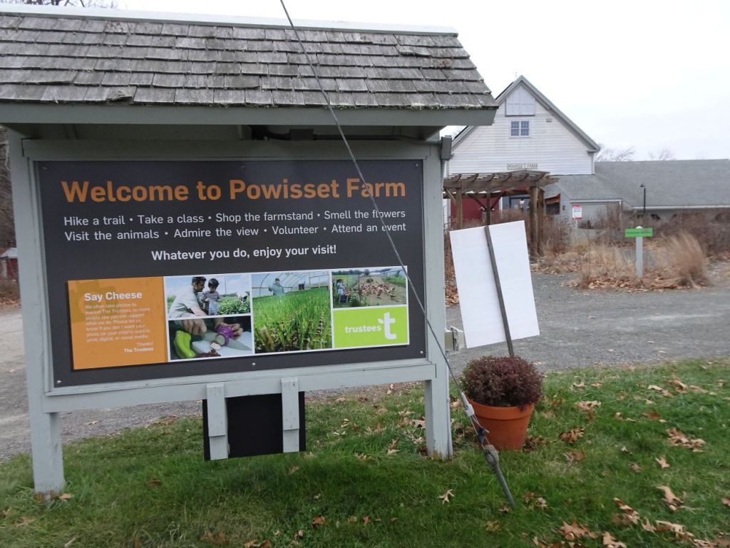 We had driven past Powissett Farm, quite nearby, another Trustees property, and had noticed few cars there. “Be willing to explore” is a strategy we use, along with “Have a Plan B”. We’d never stopped at the farm, but perhaps we could find a relatively level spot to enjoy some time together outdoors. We were surprised and pleased with what awaited us there.