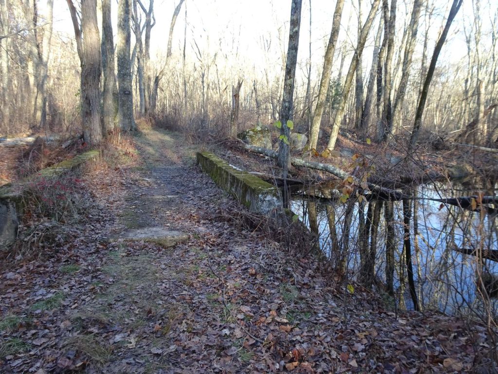 We encountered a bridge over a stream that is perhaps ten feet wide. The bridge looked as if it had been there for many years. The path leading up to the bridge was raised, as we have seen railroad beds constructed through wetlands. But no trolley or rail engine was going to navigate this path as it climbed steeply up the nearby hillside on the opposite side of the stream. I heard from Hopkinton Trails Coordination and Management committee chair Peter LaGoy, who explained, “the stream you show is part of a water system constructed in the late 1800s/early 1900s to connect Lake Whitehall to the Hopkinton Reservoir to the Sudbury Reservoir to provide water for Boston. The area to the right was part of a glebe or land given to a church for its support, that was ultimately sold to the state.”