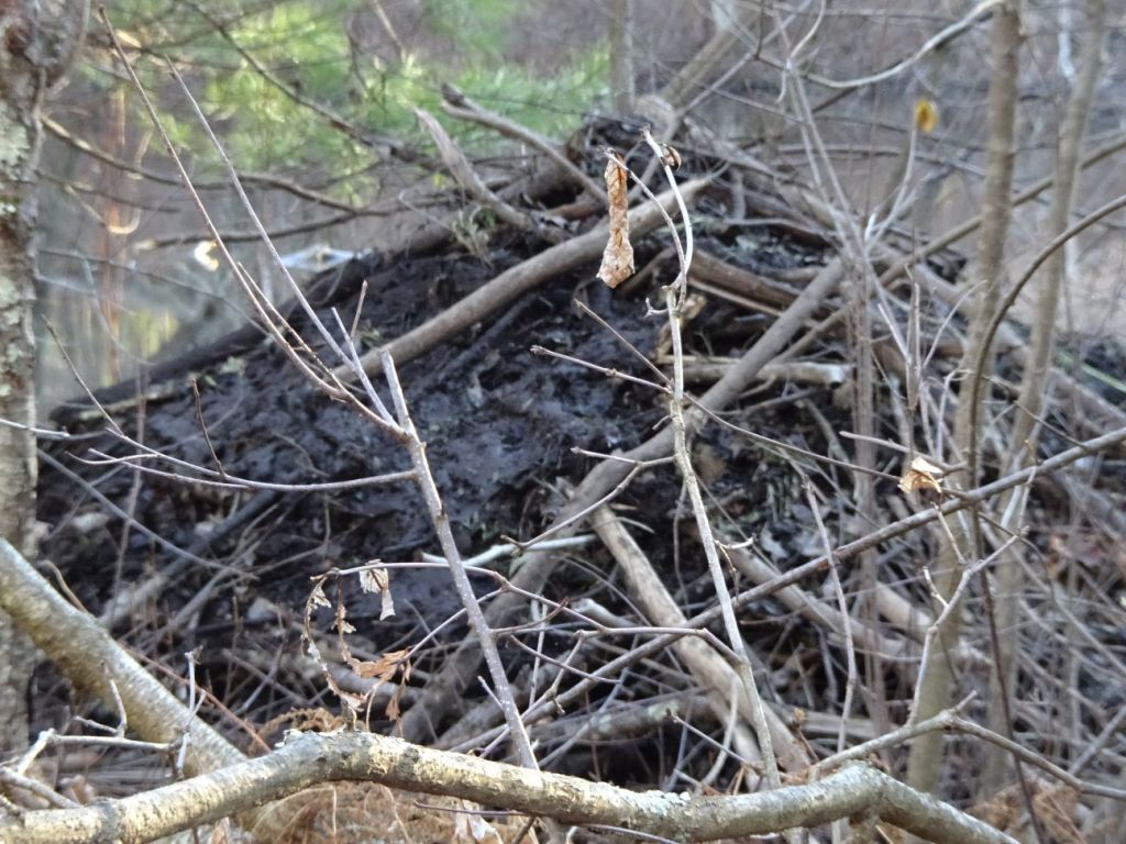 A little farther along and we found the beaver lodge up against the bank, plastered with very fresh mud. Winter is coming.