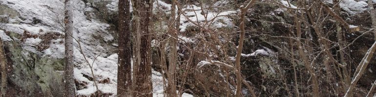 The snow was picking up as we walked along the base of Joe’s Rock. I always feel very small next to rock outcrops such as this. In the hour or so we spent, the trail had already filled with about two more inches of very light, soft powder. We could have gone farther, but decided to head for home before roads got slippery. We spotted from a distance one person walking their dog. Otherwise, we had the place to ourselves.