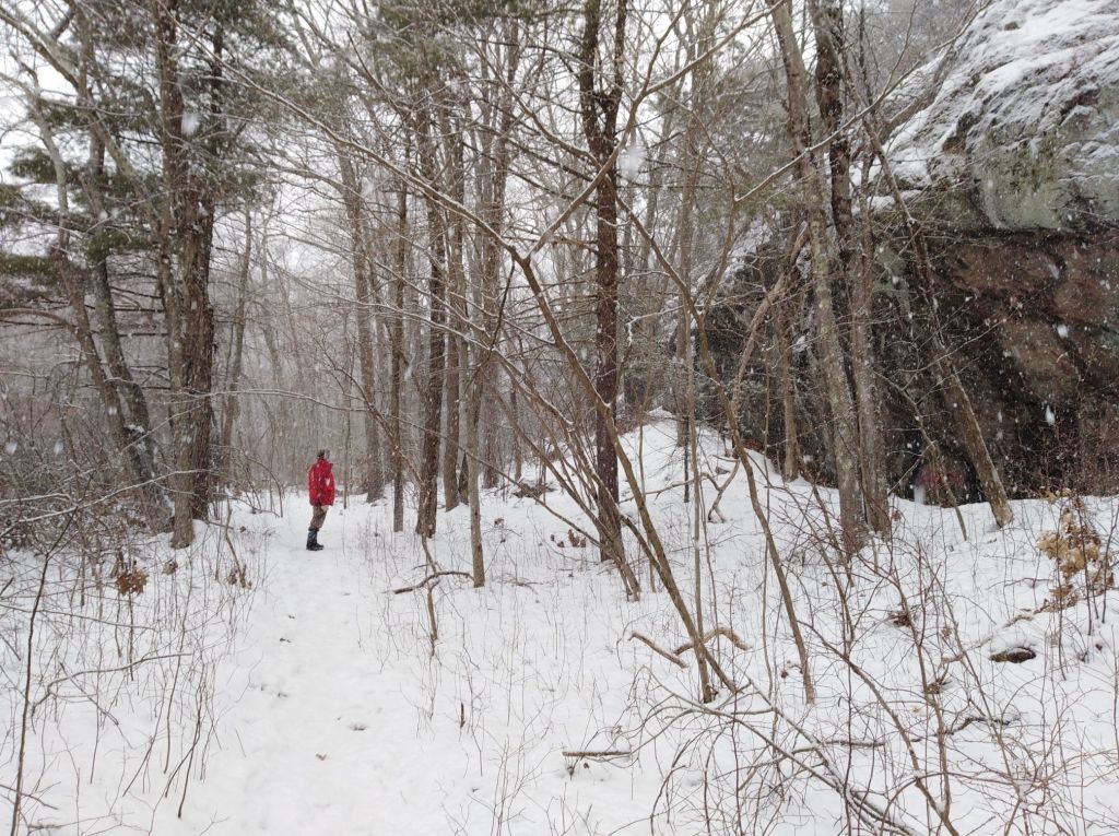 We planned to walk in the open field at Birchwold Farm in Wrentham, just as the first flakes began falling in what turned out to be an all day affair, dropping a foot of snow hereabouts. Seeing a number of cars in the icy parking lot, we moved on, and spotted, just across the street at Joe’s Rock, an empty parking lot. Whoo-hoo, time to #avoidcrowds!