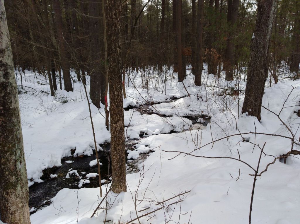 Several woodland streams stood out in stark contrast to the snow. It’s been mild enough that water is flowing pretty freely, offering a clear picture of how the stream wends through the woods, ultimately finding its way to the Blackstone River south of us.