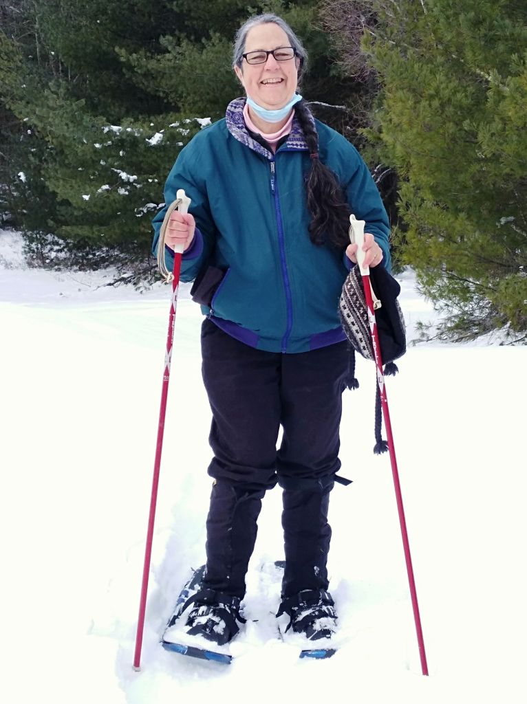 On another day we got out snowshoeing, which was great–the snow has been deep enough that snow shoes are a real help in making our way along the trail. We also had a purpose. While I do not have the balance needed to cross country ski, my husband does. We have an old trolley line railbed in our neighborhood, which leads to open woodland, a great place to cross country ski (or snow shoe). But ski tracks seem to be a magnet for walkers, especially those without benefit of snow shoes! Our purpose in getting out (besides enjoying the sunshine and the air) was to create a different track, separate from the ski track, to invite walkers to follow where we snow shoed, rather than crush the ski tracks.