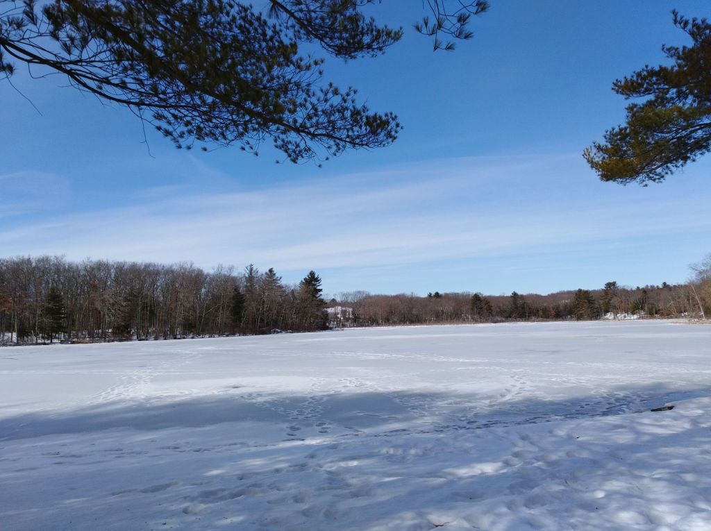Paths outdoors are filled with ice hereabouts, so we are sticking to the quiet, clear, dead end road that runs alongside the lake near where we live. We see little difference to see from day to day. The lake is frozen, and snow fills the yards alongside the road, insulating the ground of my neighbors’ properties. Except for days when fresh-fallen snow provides a fresh bright coating, our world offers a rather monochrome view.