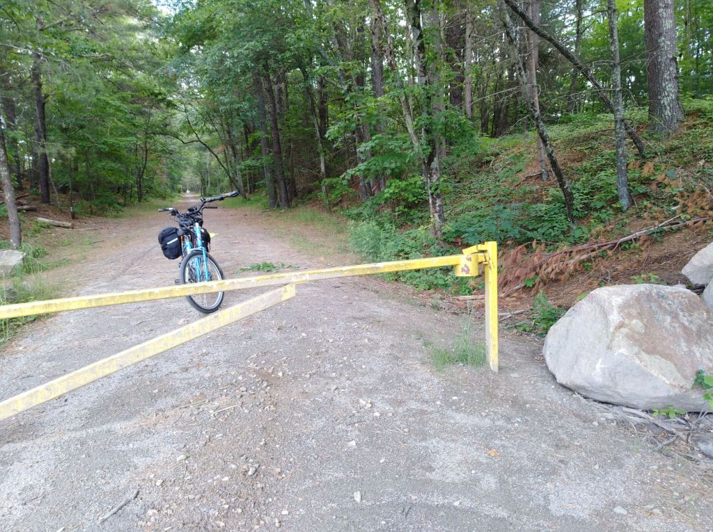 What was challenging was that the trail is really not ready for bicycles yet. Soft sand fills quite a lot of the path. Dirt bikes clearly frequent the right of way, causing deep ruts in nearby embankments. When we reached Plainfield Pike, Rt. 14A, the locked gate, meant to discourage dirt bikers, made it so we too, with our tandem bicycle, were unable to get around the gate. Other ways around the gate had been well-blocked with boulders and cement barriers. Investigating the other side of the road by foot, we found the rail trail right of way to be in very tough shape. We turned around.