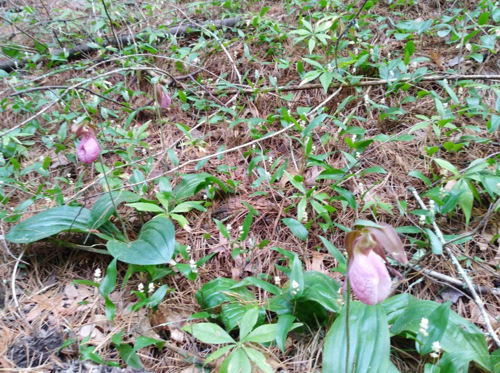 However, all was not lost. On our way back, peddling along to where we had parked next to Lewis Farm Road, Coventry, RI, (only about a two mile distance from the blocked gate at 14A) we began spotting lady slippers. First one, then another, then bunches of three and more. Before we got back where we had started, we had lost count–probably thirty lady slippers bloomed right along the trail. A lovely surprise, which we had not noticed when we first passed through.