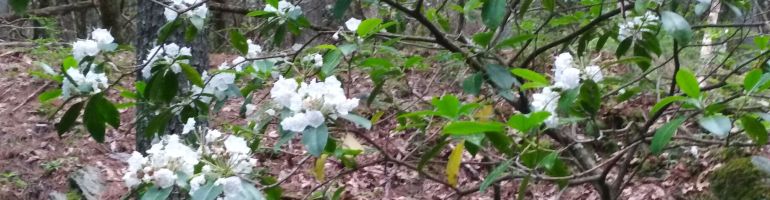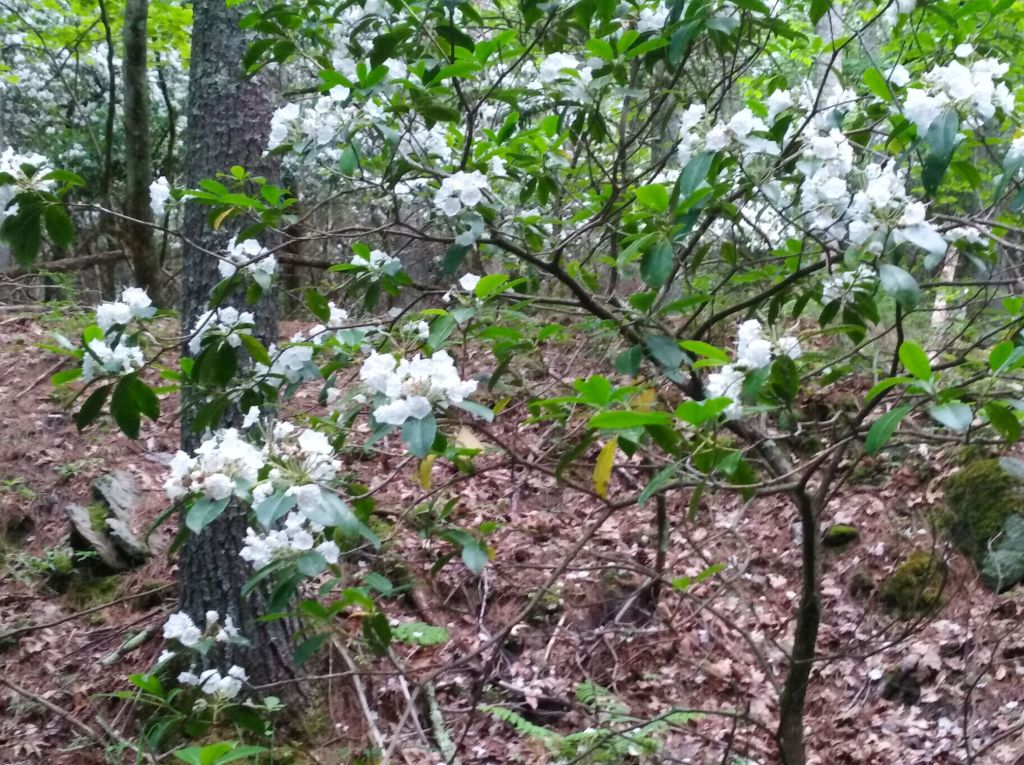 This portion of trail had quite a lot of ballast remaining from when it supported railroads passing by. But the truly wonderful find was masses of mountain laurel along the trail and back into the adjacent woodlands. The flowers were in full blossom–truly glorious!