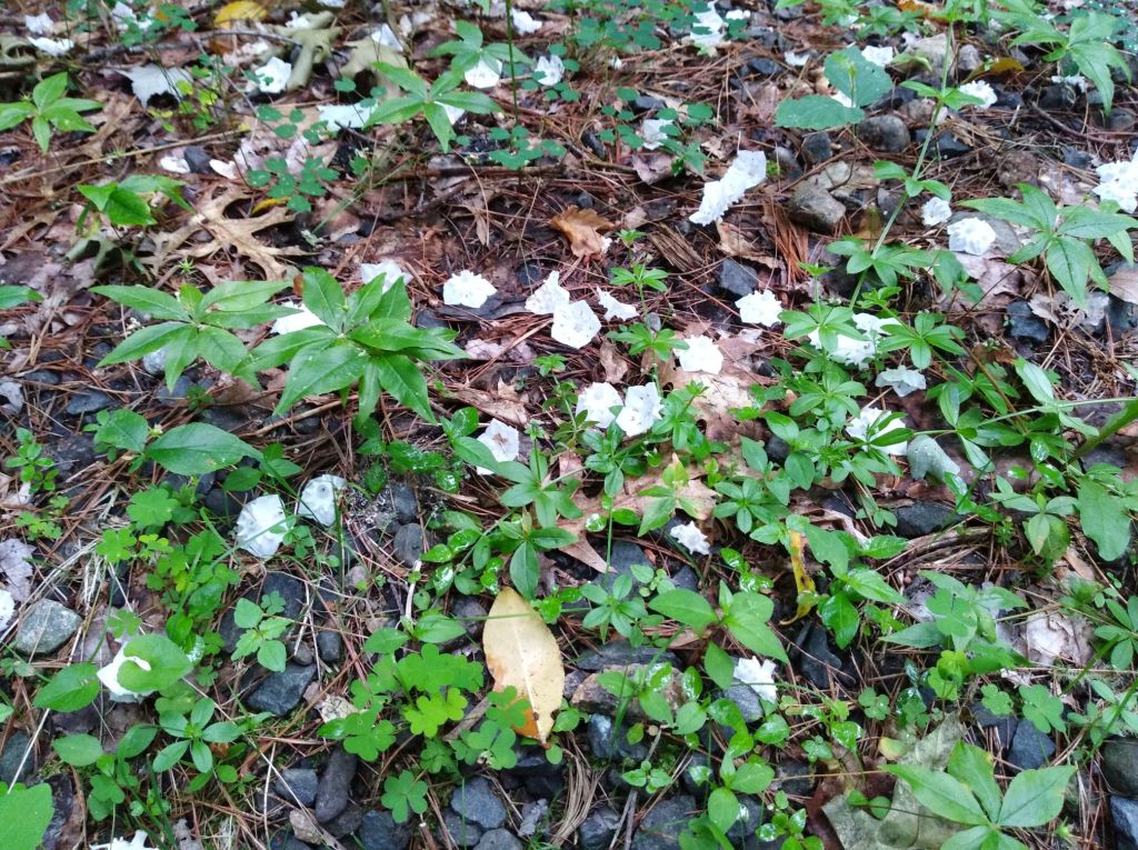 Some blossoms had begun falling, and nestled among the rich banks of ferns that lined the trail. While we chose to turn back, we were not sorry to have investigated this section of the trail.