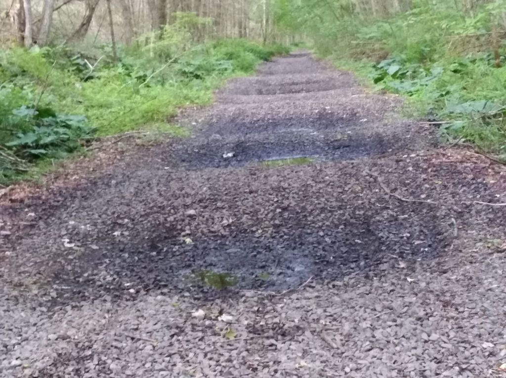 We parked next to the still undeveloped trail just off Lewis Farm Road in Coventry, a dirt road that turned out to be nice for riding our bike on. After getting back to our car, we decided to cross Lewis Farm road and head east on the rail right of way, closer to the finished Trestle Trail, and found even rougher going on this path. Humps and bumps from dirt bikes make this not much fun when riding a tandem. It had rained the night before, so the path was filled with large puddles.