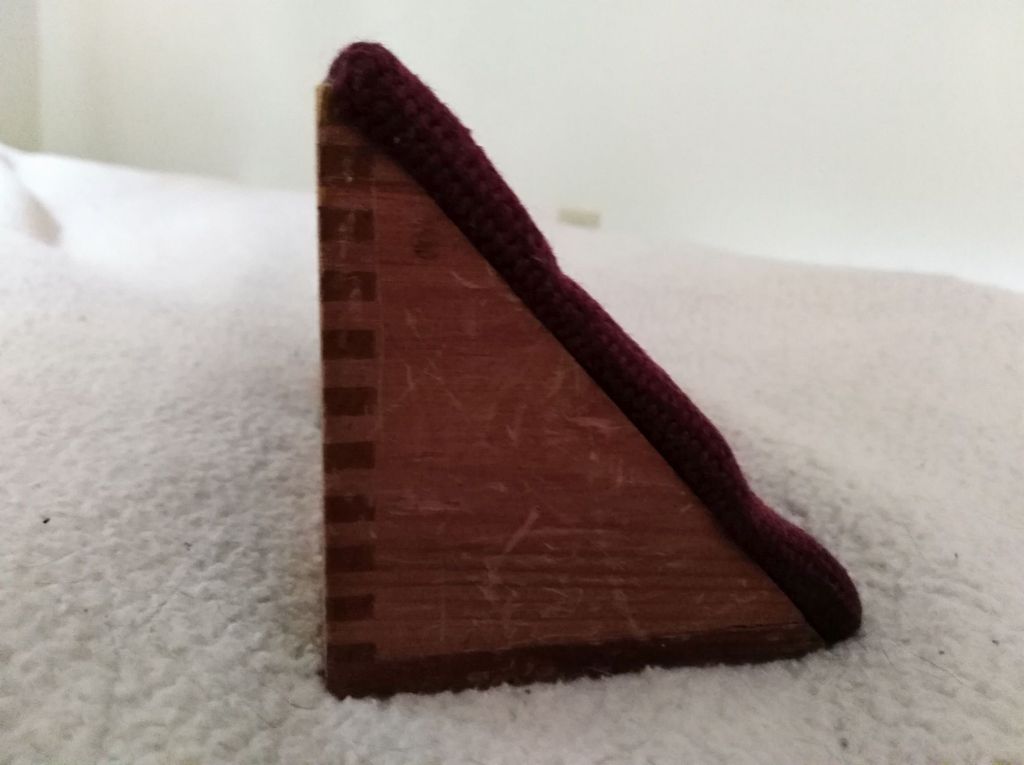 The doorstop itself is heavy. Without taking the piece apart (which I’m not going to do) I am guessing there is either a block of denser wood or something else inside behind the needlepoint to give the doorstop some heft. The side that rests on the floor has some cushioning tape to prevent the stop from scratching the floor. Behind the needlepoint itself is more wood to which the fabric was attached.