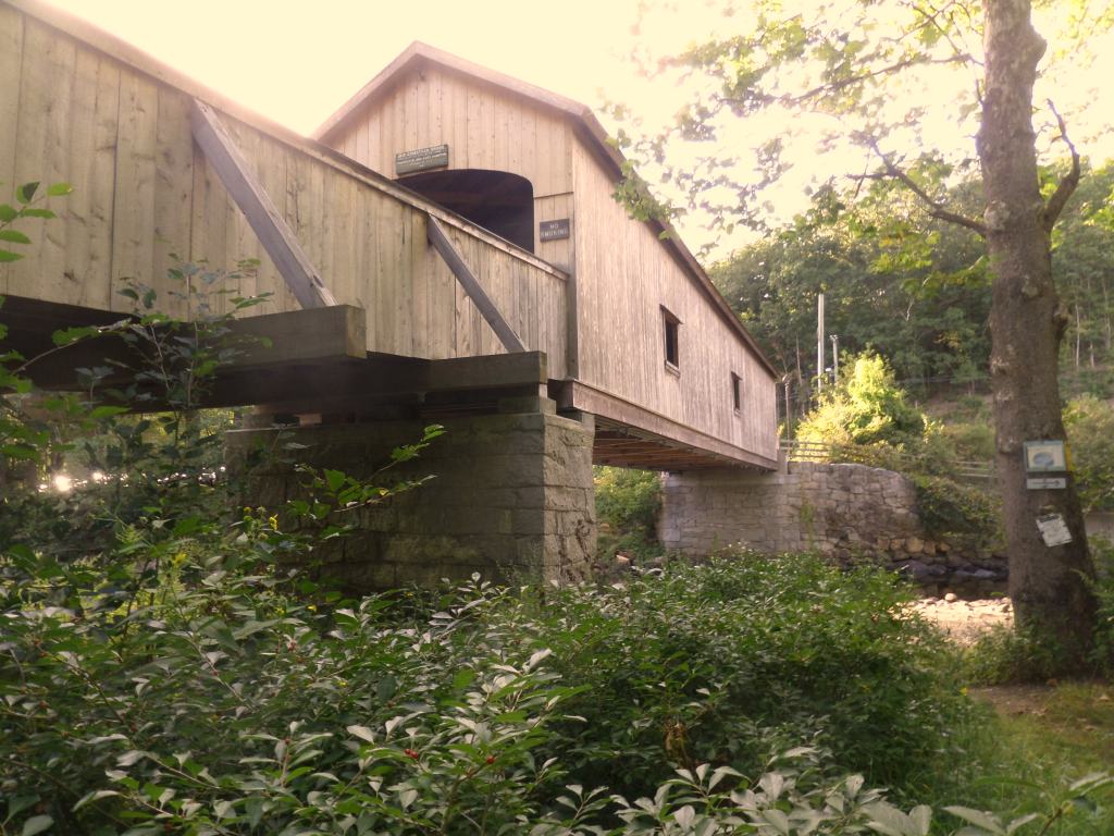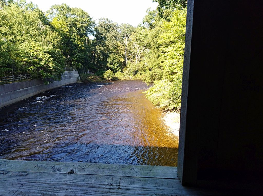 Unwilling to wrap everything up when we got back to the parking near the old railroad bridge, we stayed on the bike on River Road alongside the river, then did some road biking on Comstock Covered Bridge Road down to the Comstock covered bridge in East Hampton. We saw a few dog walkers, and otherwise the bridge was pretty quiet. The river, however, continued to roar past us on its way to the Connecticut River.