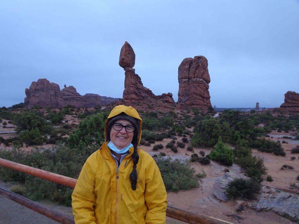 We spent the day driving toward Moab in the rain, with rain being another unexpected sight in this desert area. But since we were mostly driving, not hiking or trying to bike, it was not a hardship. We arrived in Moab, found a campground to leave our camper in, and headed over to Arches National Park, only a mile or two from the campground where we stayed for several days. Arches is quite well-known, and literature suggested it is often very crowded. Perhaps going in the rain would be a way to avoid crowds? Success! Yes, there were others wandering the park in the rain, but not the crowds we’d read about.