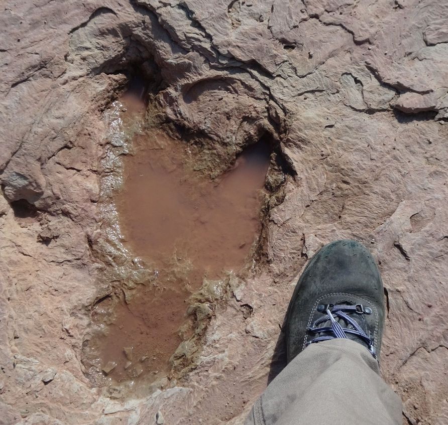 Waiting our turn to get back to see the rest of Arches National Park, we looked on Google maps and found a spot nearby that promised dinosaur tracks, Copper Ridge Dinosaur Tracks. This was not nearly the Easy Walk we enjoyed at the national park. My hiking poles came in very handy as we headed up the slope to the marked out tracks in the rock. The trail kiosk promised there were additional tracks, but I did not find them. As it was, we had fun seeing the huge tracks that we did. This spot was much less crowded than Arches. Just a few others were there at the same time that we visited.