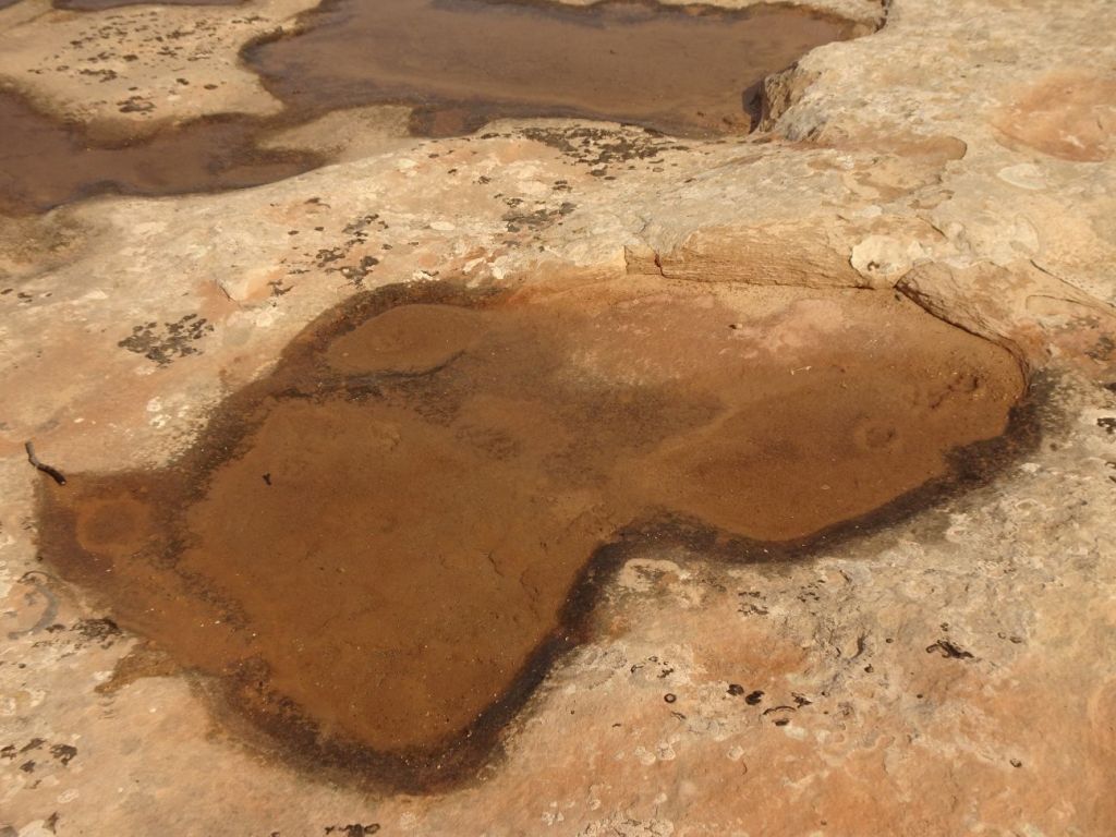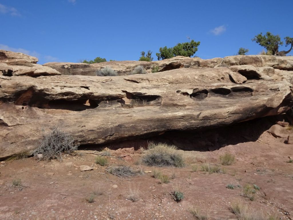 We spent another day in the area (five in total) and headed towards Canyonlands National Park, also in the general Moab area. On our way to Canyonlands we spotted a number of informational kiosks offering interpretive information. These were on BLM (Bureau of Land Management) land. One stop offered information about desert plants. Another pointed us to “potholes,” depressions in the rock surface, formed by water action in years past, and now a valuable source of collecting water from the rare rains in this desert environment. Since it had recently rained, some of the potholes retained water.