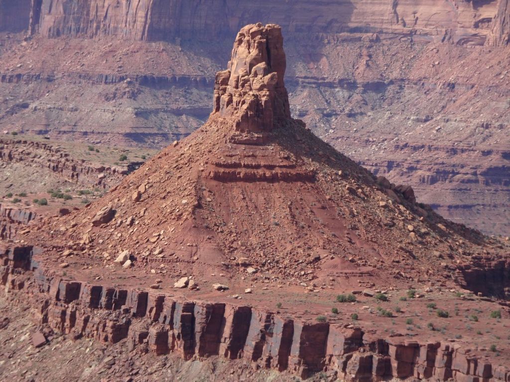 We read in the park pamphlet of a road down into the canyon–ah, mystery solved. This was where those cars I had seen from Dead Horse Point State Park had been gaining access to the canyon. I was curious, and we took our four-wheel drive truck down the track only a short distance when it became clear that we had neither time, nor were comfortable navigating this rough track with steep drop offs right next to the road.