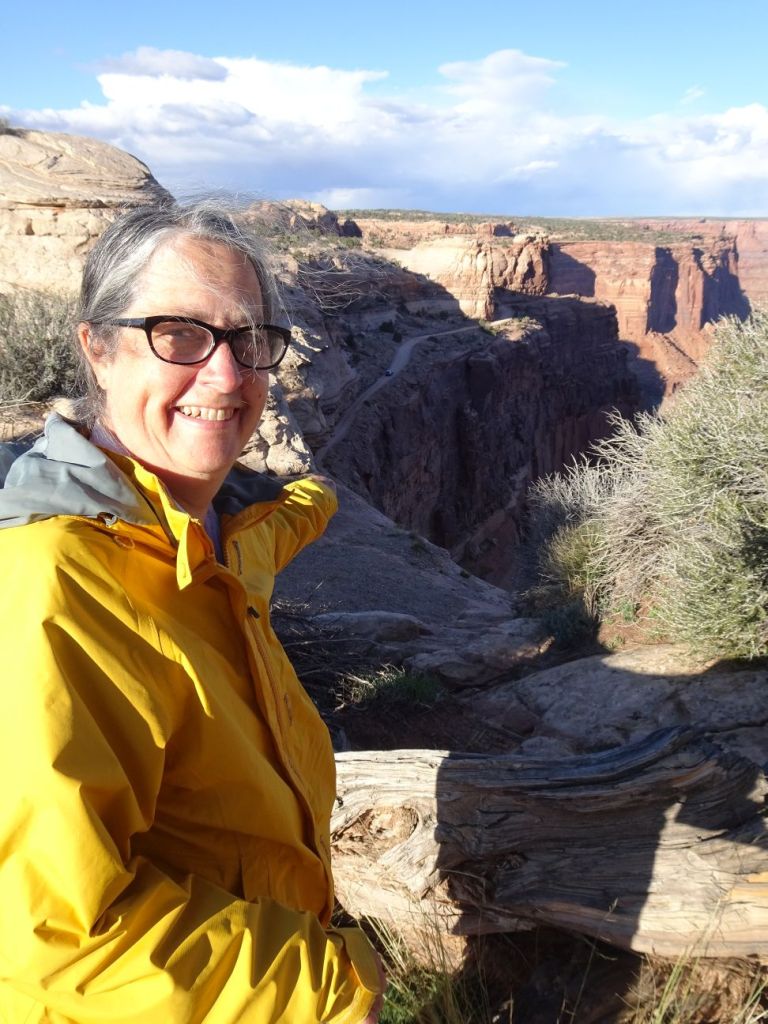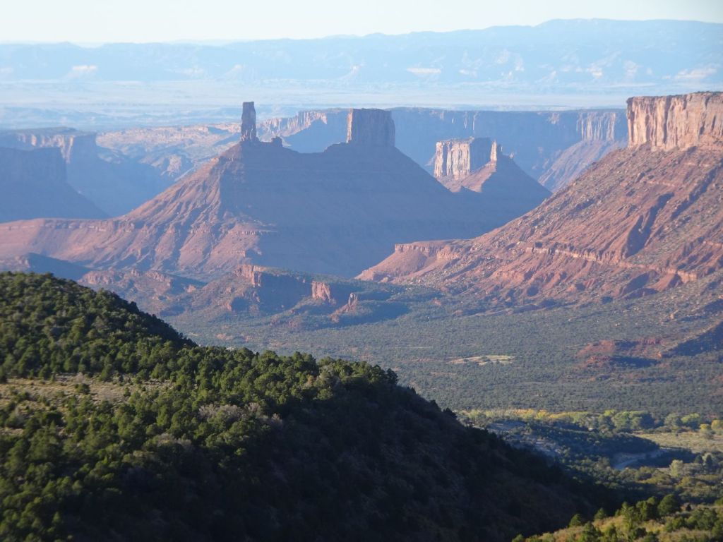 Before we reached the Canyonlands entrance, we spotted a sign for a state park, Dead Horse Point, and thought it might be less crowded than the national park. We found there scenery that rivals what the Grand Canyon offers. I spent the afternoon perched at an overlook while my husband took a hike along the canyon rim. He saw perhaps two others the entire two hours he hiked along the rim of the canyon, created by the Colorado River. As I peered out over the canyon, I kept seeing cars driving down a dirt track on the opposite side of the river. I was intrigued….