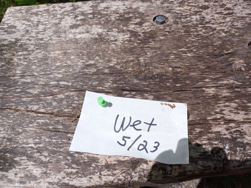 Multiple benches along the way overlook marsh areas. One bench had a puzzling message on it. Evidently a traveler of some sort wanted us to know this important information. How relieved we were to find the bench had dried out since the posting of this warning. Clearly this was a well-equipped person carrying push pins. Not something we keep in our pack!