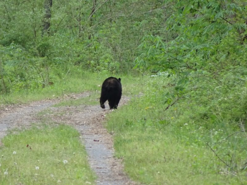 Very few people were on the trail (it was a weekday). The one fellow traveler we encountered tipped us off that a black bear was near the trail. Keeping our eyes open, we encountered the bear, not off in the distance, but at the edge of the trail, staring right at us. We got the impression she may have had a cub with her and she looked wary. We kept pedaling. Once we put some distance between us and the bear, we stopped to see that she was now up on the trail, keeping us in her sights. We grabbed some photos, but by time we had gotten our camera out she had turned her back to us and headed the other direction down the middle of the trail.