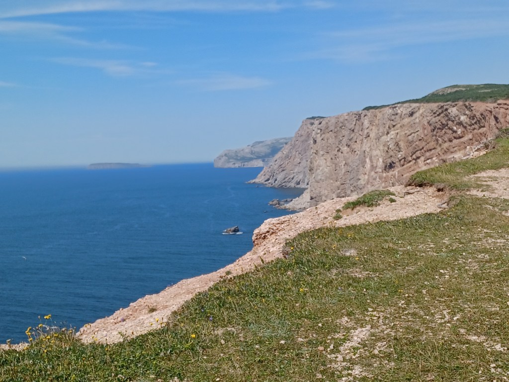We encountered other pelagic birds besides puffins when we visited Boutte du Cap Provincial Park near Port au Port. Well-worn footpaths along the top of steep cliffs offered Easy Walks for me to enjoy, along with amazing views. At the end of the trail kittiwakes soared past us on their way to fetch food from the sea. A constant stream of birds sailed past us as we stood near where they built nests on rock shelves overhanging the ocean. Their constant cries filled the air as we witnessed a whirlwind of small gulls with characteristic black wingtips circling their colony. When we made our way to the east coast we saw them again, whirling away exactly as their relatives in the west had been doing.