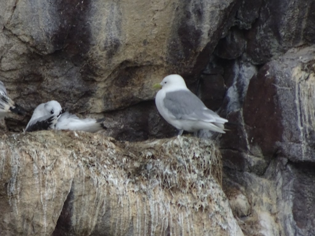 The kittiwakes nest on cliff shelves where they line the rock with grassy like materials. Murres, (they look like penguins and sound like donkeys braying or elephants trumpeting) nest on bare rock. Why their eggs are so pointy has been a source of debate–here’s an intriguing research paper that offers details about why their eggs are so singularly shaped. Puffins, on the other hand, are silent partners in this concert unless someone like a researcher (the only ones allowed on these protected islands) steps on a puffin burrow by mistake. They need sloped, grassy spots where they can dig their burrows.