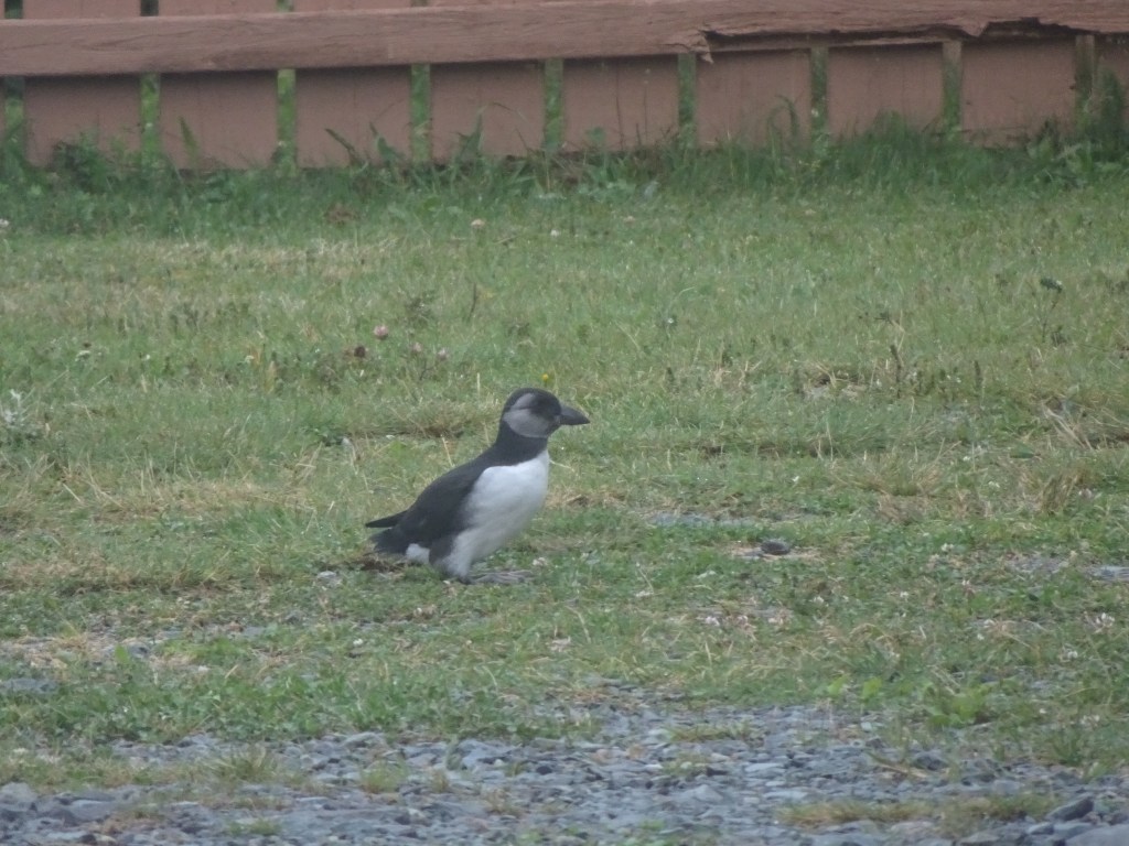 When we arrived at our cliffside campground we heard about the pufflings and the researcher, Taylor, from a university in Ontario, who spent the summer being a one-person puffin patrol. She is the only person allowed to rescue the puffins where we were. One morning my husband spotted a small bird hiding underneath our truck. I went out to investigate and realized we had a stranded puffin in our campground. The little guy tried hard to escape but the wooden fence at the cliff’s edge frustrated his attempts to fly. He stopped to take a breather then skittered underneath one of the large RVs at the campground. I told a fellow camper about the errant puffling. She knew the puffin patrol lady, and soon we had the help needed to safely grab the little guy and get him to where he could fly back to his burrow.