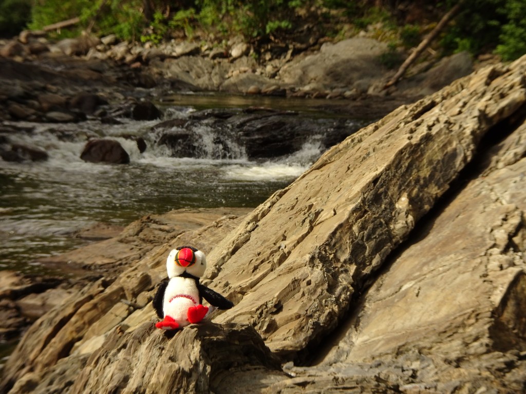 I wish we had thought to get a photo of Smoky using our telescope to check out h is family on the islands next to where we stayed. As it happened, it was not till we returned to Gros Morne National Park that it occurred to me to send him on an exciting trip rock scrambling a thousand feet onto the peridotite Tablelands mountains (not an Easy Walk–I stayed in the shade and enjoyed my book). Smoky managed the trip like a trooper, (his sherpa was more wiped out but had a great time regardless). Our little mascot admitted that he was glad to get back down after such an arduous climb.