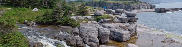 We had just had some heavy rains, filling the brook and making for very tricky footing. I stayed on shore while my husband rock-hopped out to the small island in the brook where he took his shoes off and waded in for a closer look. He got some great views of the fossils, preserved trees turned to rock. We were the only visitors when we stopped on a July morning. Like many other places while in Newfoundland, we often found these outdoor sites to be surprisingly uncrowded.