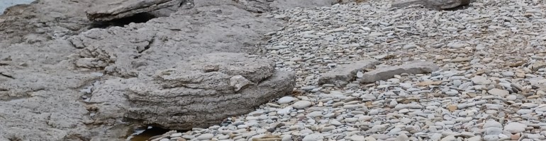 Danny’s trail, a wide, packed, mostly level gravel path along limestone cliffs was a perfect Easy Walk that offered mountain views across the water. We met few others on the trail, and those we did see soon moved past us, leaving us once more alone to enjoy the wonders all about us. The rocks below had the feel of huge sculptures. Crafted by no human hands, these spectacular formations were sculpted into the limestone over the years by wind and waves.
