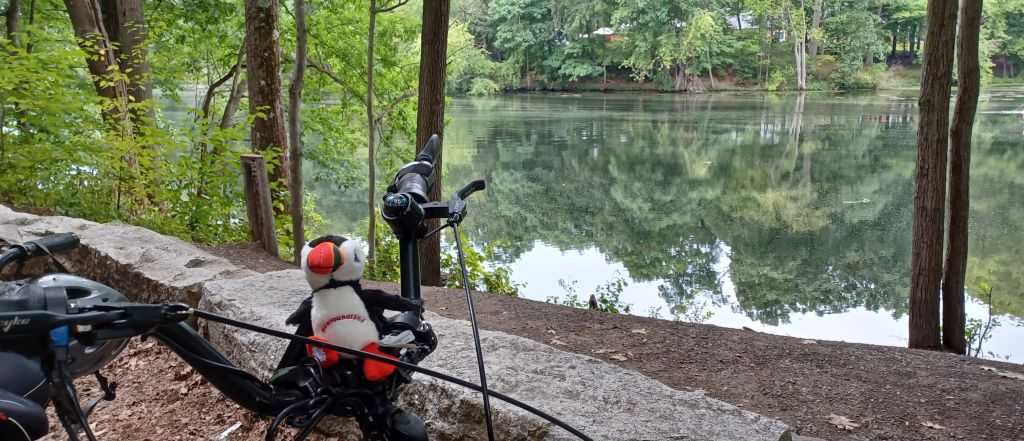 You never know what will happen when you get outdoors. This trip started at Ayer, MA and took us all the way to Nashua, NH on the Nashua River Rail Trail. We brought along our mascot, Stormy, (aka Smoky.) He’s now Stormy, having donated his previous name to our new kitten. Our tandem bike, Shermy, did great after his international travels to Canada, including two ferry rides. And we almost encountered a black bear on the trail. The bear was quick, crossing the path before we could get a photo, but it was definitely a bear.