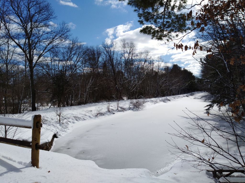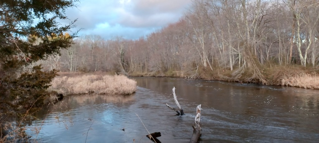 We went on a recent walk at Riverbend Farm state park, Uxbridge, MA, in winter. This is a place I have visited so many times in the past, in every season. We saw on that chilly day the Blackstone River, full to overflowing after recent rains. The sunset was spectacular, although my camera did not do it justice.
