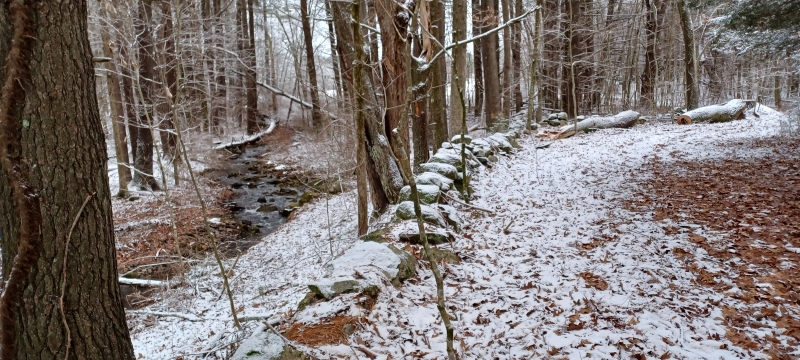 I love spotting stone walls wherever we go, but New England farms typically have some good examples of these iconic features of the landscape. Winter is a great time to see stone walls and contours of the land after the fall leaves have dropped and the shrubs have been pushed aside by snow. One wall at the edge of the meadow was difficult to see as dense vines nearly encased the rock remnant. Another wall, however, was in clear sight. A rushing stream next to the path added an enticing soundscape as we walked.