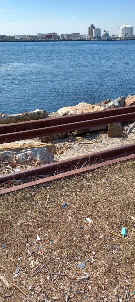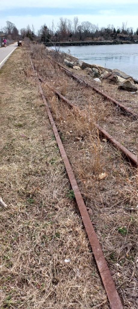 We walked along the northern end of the path, beginning at one of several paved parking areas along Veterans Memorial Parkway in East Providence. Right along the shoreline of Narragansett Bay are metal tracks that once carried train traffic alongside the bay. Lying where they were placed along a raised, 12-15 foot wide level surface, the rails run next to the paved bike path.