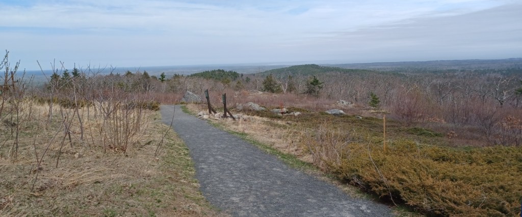 The relatively flat top of the hill (not really a mountain at about 800 feet, but still, great views) lends itself to taking your time to wander and enjoy the views. Picnic tables are set out near what appears to be a education building. Strategically placed platforms invite visitors to take in views of the White Mountains to the north and west, and the ocean to the south and east.