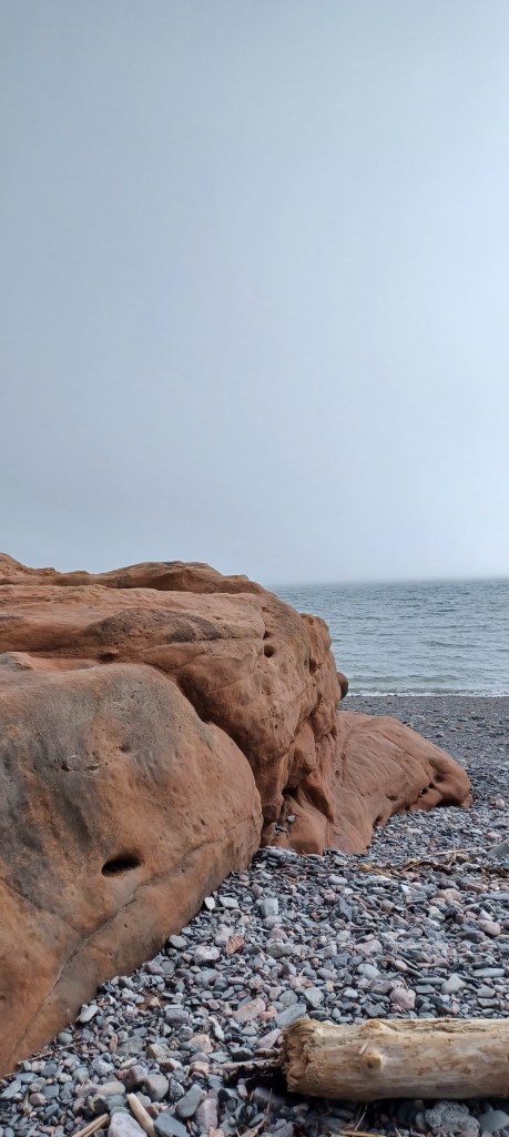 Cape Chignecto Provincial Park on the Cape Chignecto peninsula in West Advocate Harbor, NS, offers views of the Bay of Fundy from the Nova Scotian side of the water. When we arrived at the park we were advised to get off the beach within the hour since the incoming tide would soon close off our escape route. We kept an eye on the clock (and the tide!), wandered the shoreline and some of us (not me!) climbed on the orange-ish sandstone rocks that have been sculpted by the wind and waves. It felt like we were visiting an outdoor sculpture park.