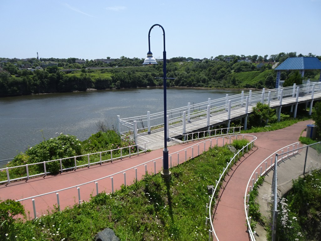 Across the bridge that crosses the river (there is a pedestrian sidewalk on the bridge) is a handicapped accessible walkway out to the opposite side of the river. This offers some different views and some shade. Depending on the tides, the river may be calm, but it does not stay that way for long. Just when you think nothing is going to happen the current begins churning again.