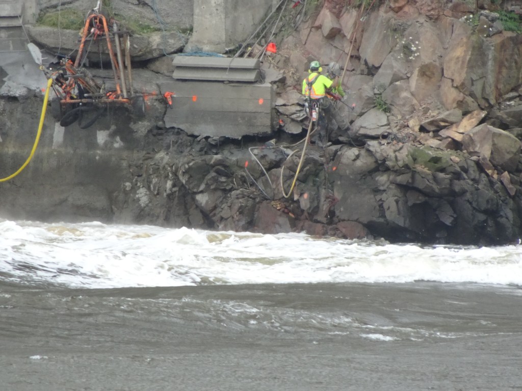 On one of our visits to this small park area along the river, the paper mill across the way that is directly on the river was undergoing construction of some kind. Watching workers dangle over the churning river was breathtaking. I did not envy them the view they (enjoyed?).