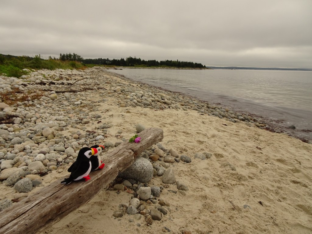 Whenever we set out to explore we make time to stop and investigate interesting spots along the way. A small beach along the roadside looked like a nice place to spend some time next to the water. Our puffin friends had been left behind on several of our outings so I took them along to the beach and invited them to enjoy the shoreline.
