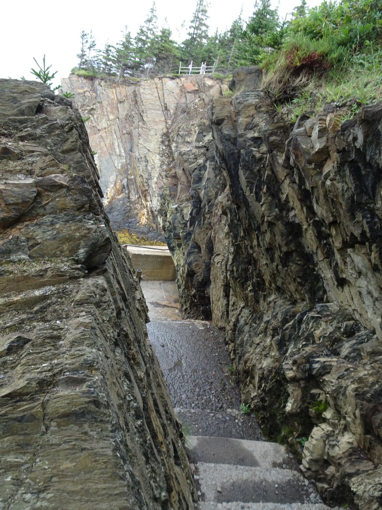 Several other viewing platforms were built along the path for visitors to enjoy. They offer better views of the dynamic sea caves than simply remaining on the gravel path. Reaching some of these viewpoints was manageable for me, with assistance. One narrow stairway leading down near the shoreline required a tight squeeze between rock walls. I stayed near the top while my husband headed down to investigate.