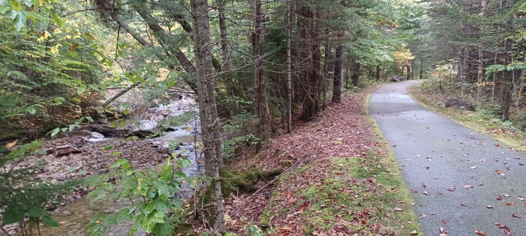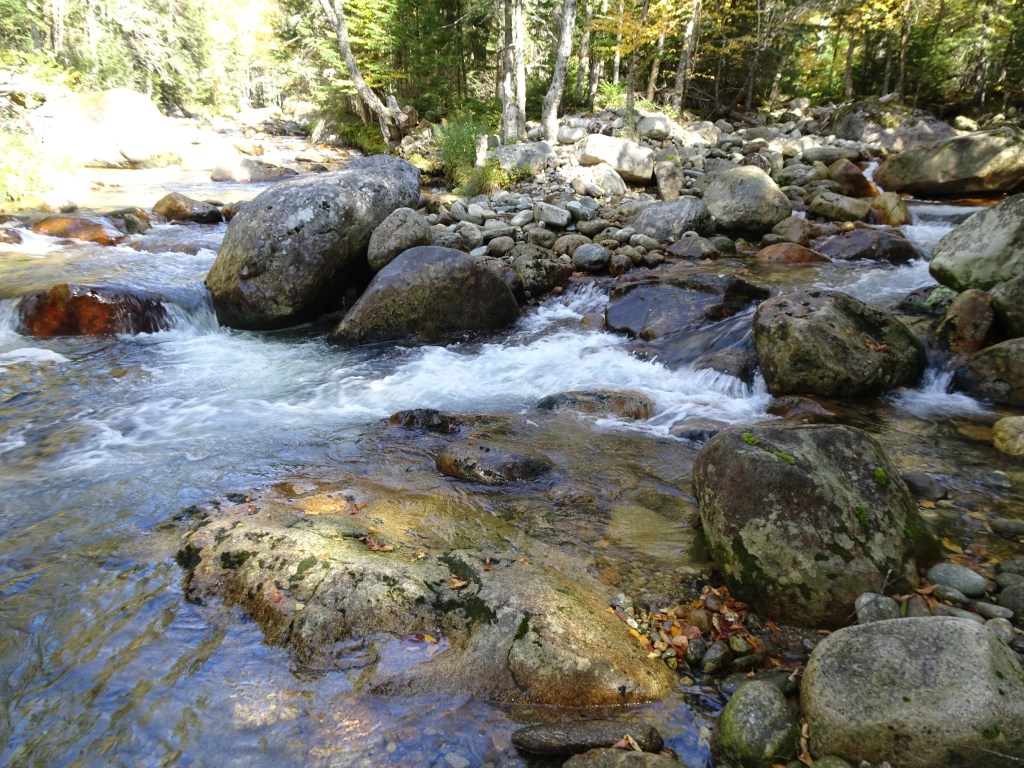 Public (although unpaved) Jefferson Notch Road in Campton, NH, turned out to be the perfect Easy Walk for me. A seasonal, well-maintained dirt state road, it leads to the Caps Ridge Trailhead, the highest elevation trailhead on a public road in New Hampshire. We saw little traffic as we walked, which allowed us to amble alongside the brooklet that tumbled downstream next to the road. A number of pull-offs have been constructed along the way. Regardless of whether we could see it or not, we enjoyed an enchanting watery accompaniment to our every step.