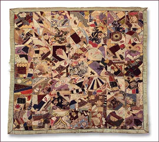E.J. began sewing quilt pieces (when assembled a “crazy quilt” pattern was followed) in the 1870’s during her cross-country train trips. With a train car filled with professional entertainers, she (and they passed these hours playing cards with her fellow theater troupe members, and telling stories. She spent hours writing letters, and piecing together scraps of fabric. The material she used to sew these quilt sections came from fabric taken from hers and fellow actresses’ costumes, neckties of fellow actors, and other unidentified fabrics.
