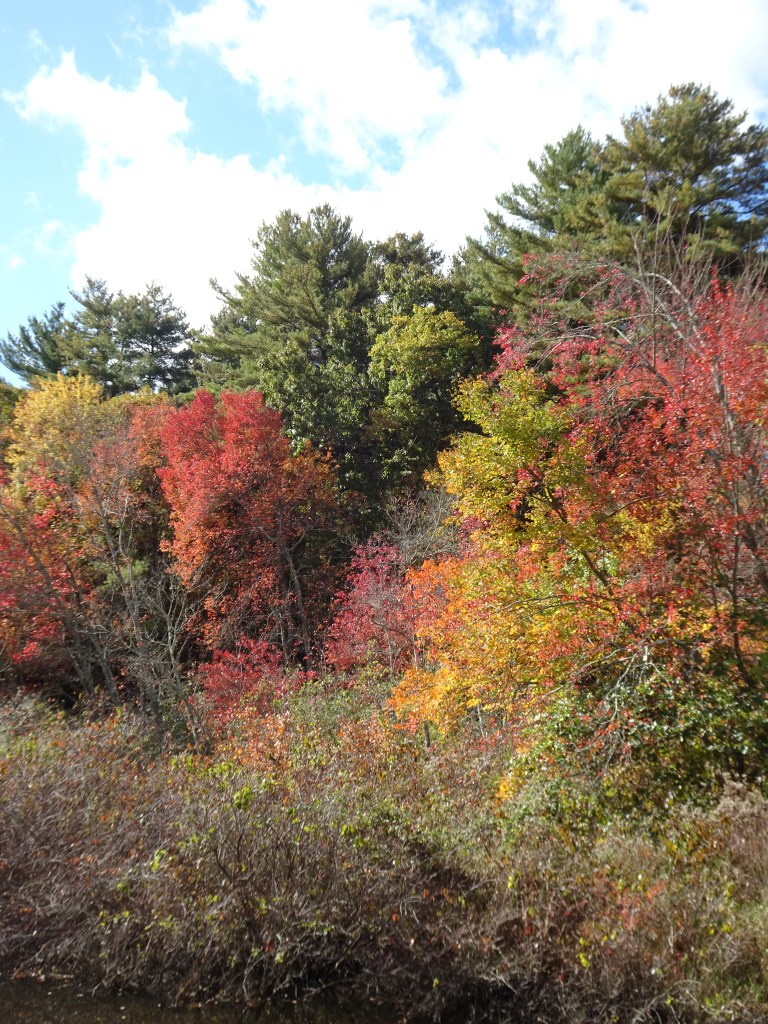 My last stop on this tour was at the Gertrude Cornish Town Forest. The forest itself is wooded with clear paths. Adjacent to the property is access to town water department property, along the Canoe River. Trees along the river were clinging to their autumn colors. The blue sky provided the perfect backdrop for pictures of the open space created by the expansive wetlands alongside the river.