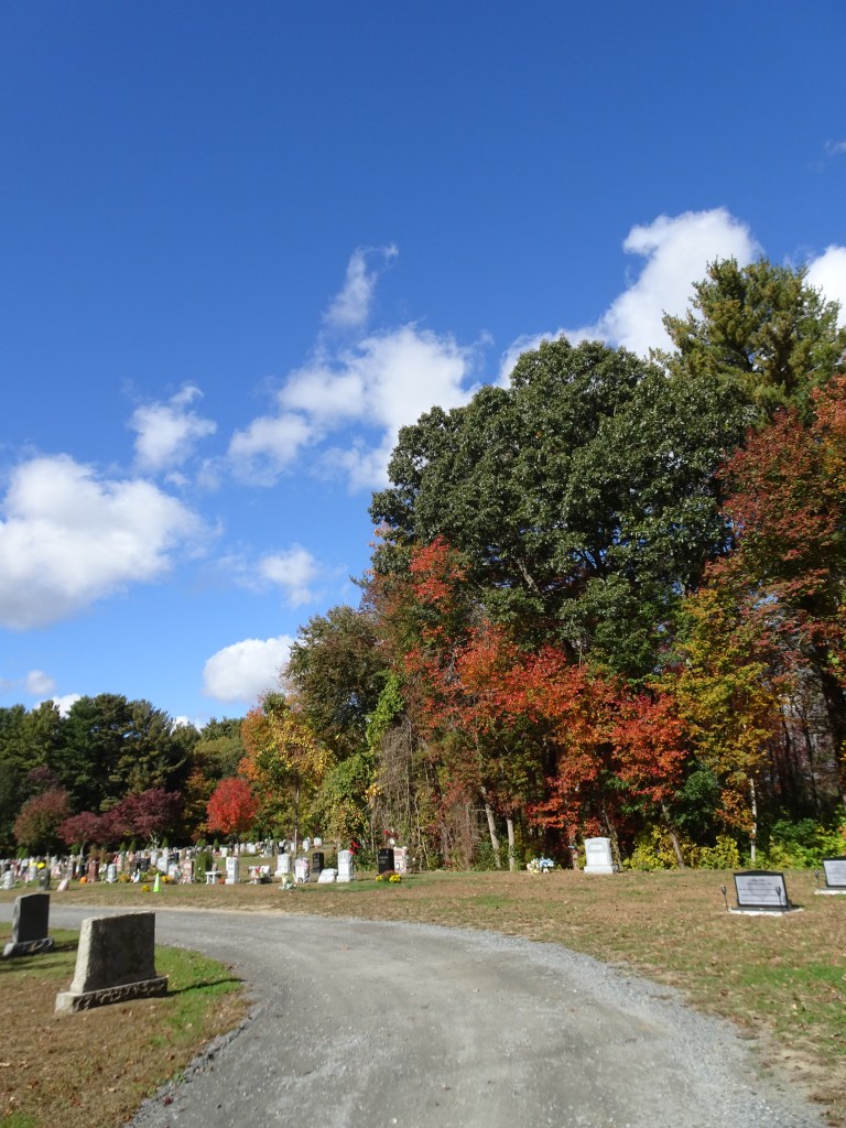 Across the road from the town forest is a small cemetery. It abuts the river, which runs directly behind the cemetery. I crossed the street to walk among the headstones. Some trees glowed in the sunlight while others had already shed their leaves.
