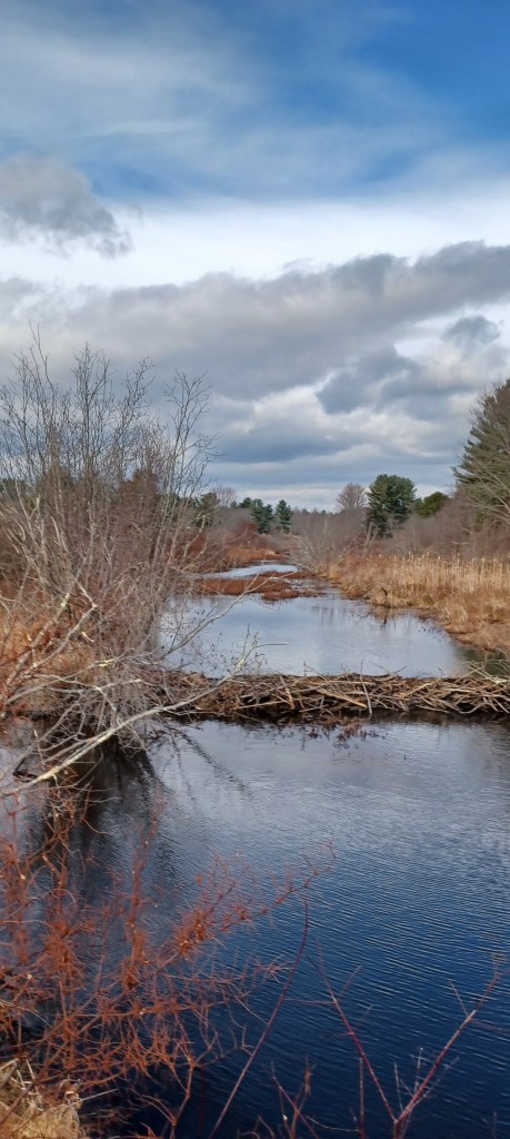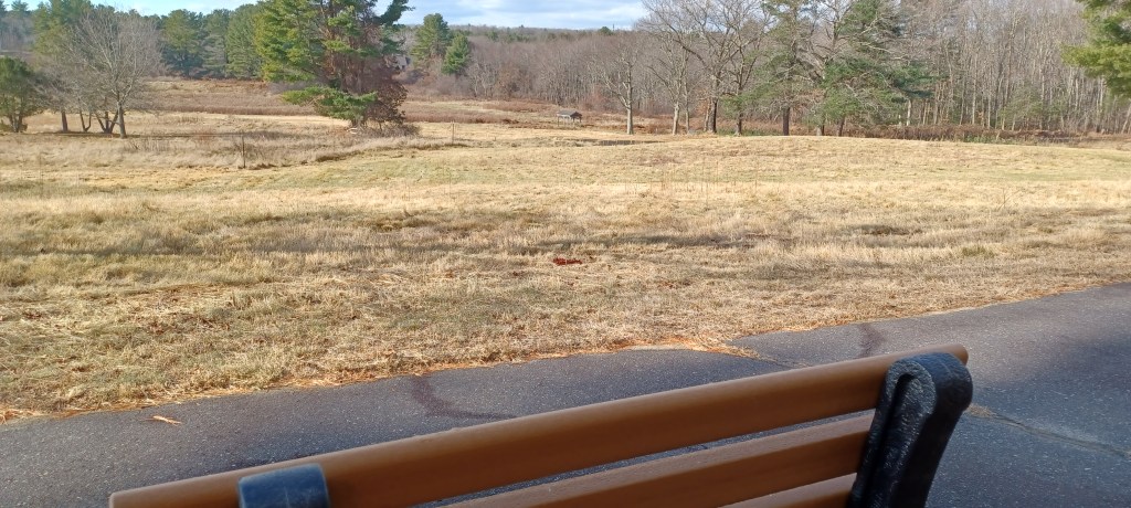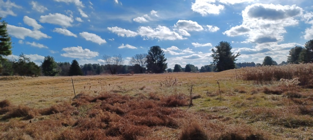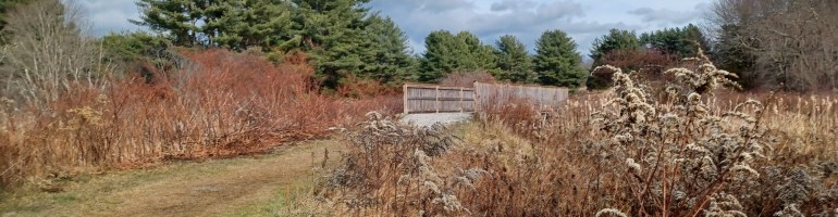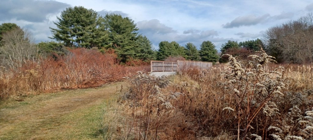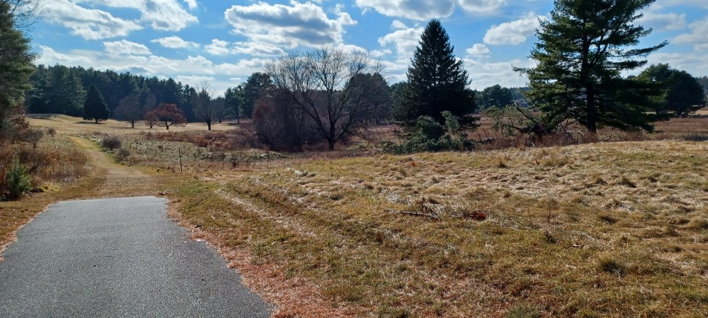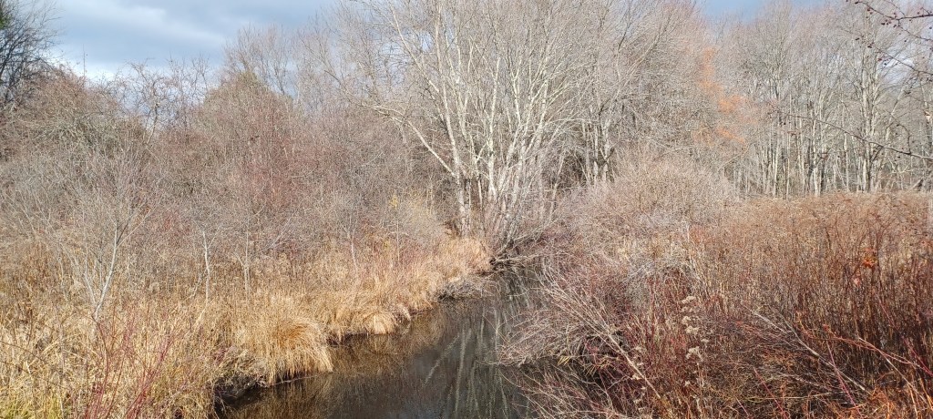 We visited in late fall on a day when sunshine mixed with overcast skies. Trees growing along the edge of the open field were bare. The trails will look quite different when trees are in full leaf. The brook will fill in spring. The scrub alongside the paths will green up for sure.
