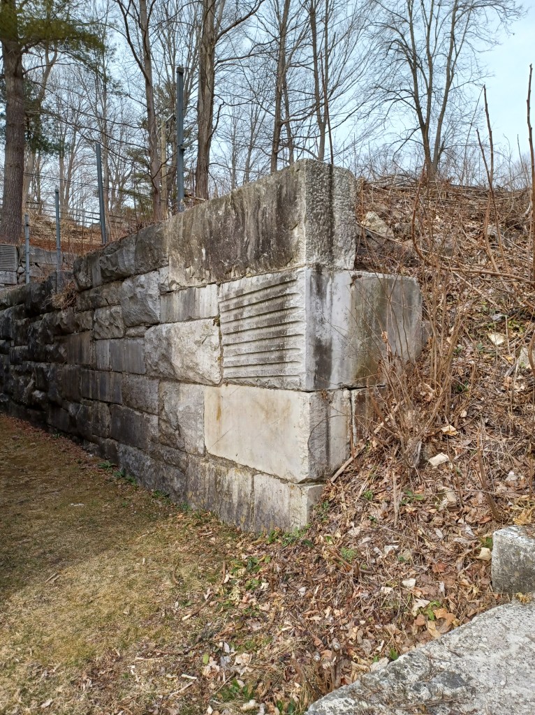 It seemed obvious to us that the stone used at this site had come from the nearby quarry we had just visited. A retaining wall, which holds back the steep slope that rises above the river, is constructed wholly of marble, gorgeous white rock with black streaks.